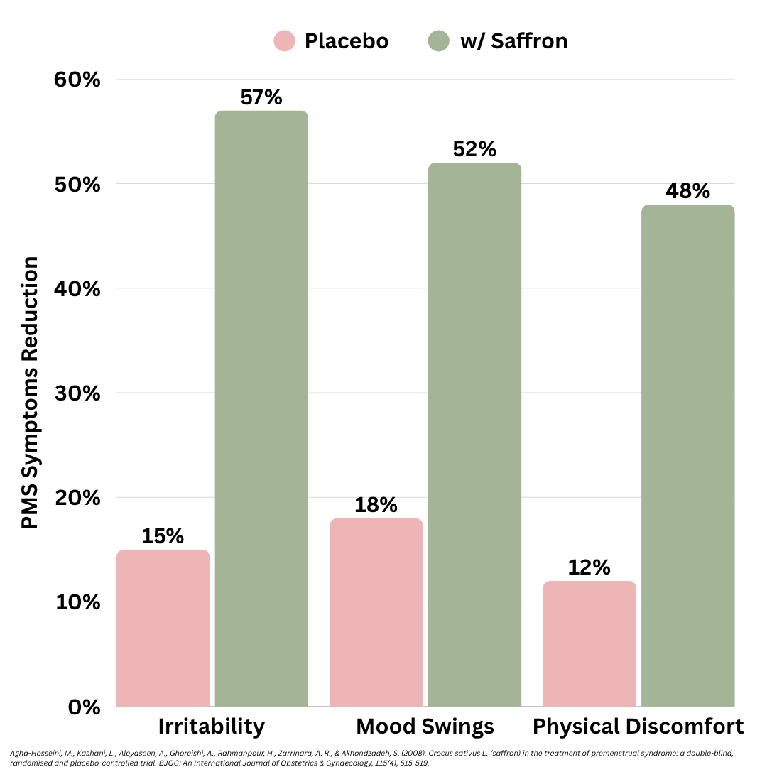 Imagine moving through your entire cycle without the dread of "PMS week." Saffron's clinically-proven formula works at the hormonal level to reduce irritability, stabilize mood, and ease physical discomfort—so you can stay magnetic, focused, and fully yourself, all month long.