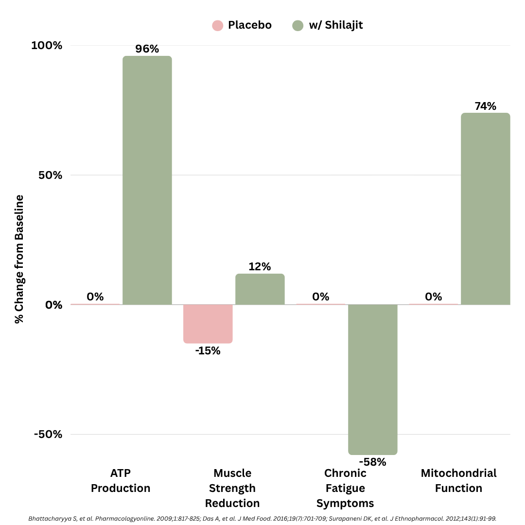 The research is clear: Shilajit delivers. In clinical studies examining its effects on energy and fatigue, participants experienced a remarkable 96% boost in ATP production and 58% reduction in chronic fatigue symptoms—without a single stimulant. By supporting your mitochondria (your cells' energy factories), Shilajit helps restore the deep, sustainable vitality that lets you power through your day feeling focused, capable, and fully yourself.